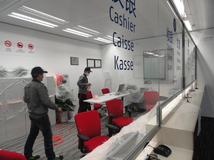 施工人員對簽證收銀區(qū)進(jìn)行治理。